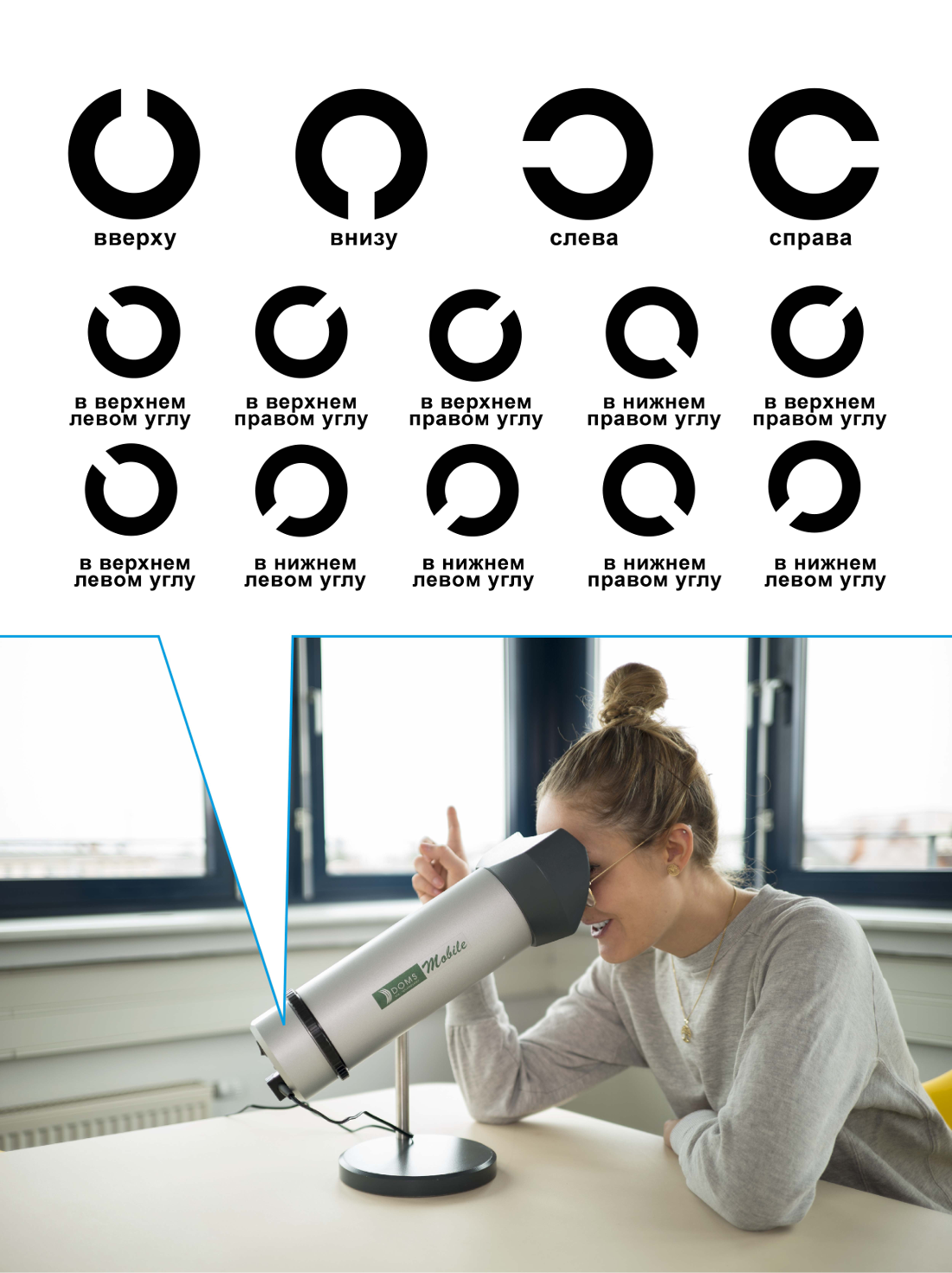 Cмотрите обоими глазами в прибор для проверки глаз. Вы увидите круги с отверстиями.